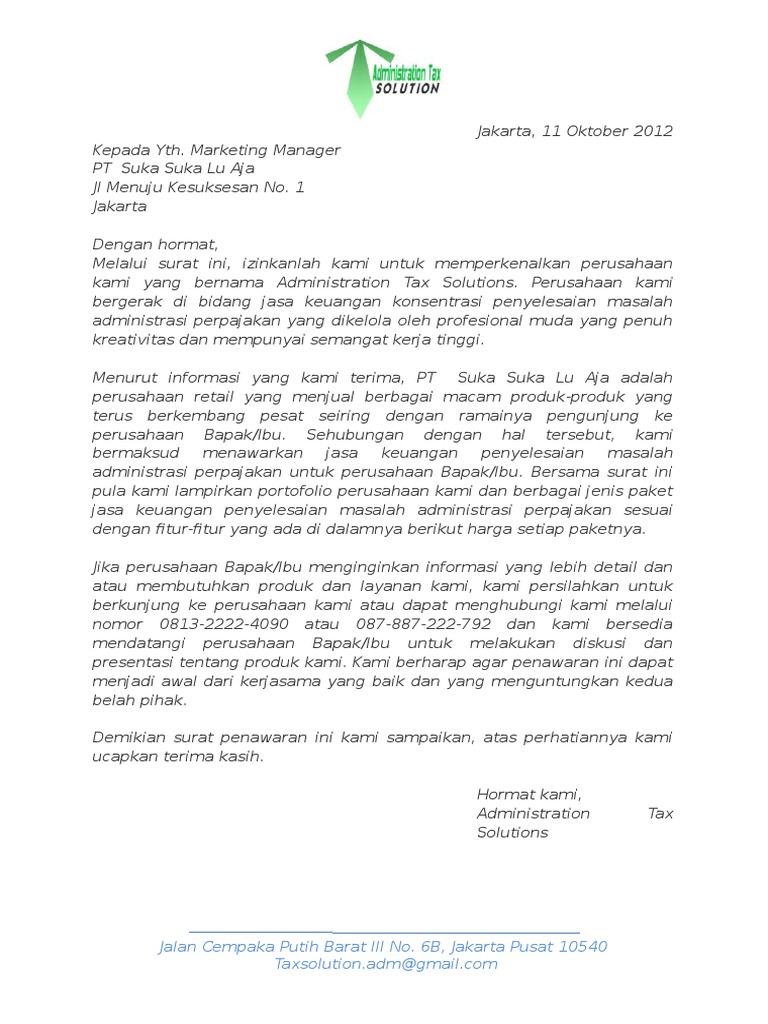 Arina consulting group konsultan akuntansi dan bisnis ukm ruko tangcit, jl. Meskipun demikian, jasa yang ditawarkan harus sudah jelas dari bagian perihal, sehingga surat mudah dibaca. Penawaran jasa konsultan pengawas rumah sakit. Surat penawaran termasuk salah satu contoh surat resmi. Segar alam abadi consulting yang dalam hal ini kami bergerak di bidang konsultan bangunan, khususnya dalam perencanaan dan renovasi pembagunan rumah impian dengan berbagai kondisi awal bermaksud untuk memberikan. Penawaran perencanaan kepada yth, perusahaan yag dituju di tempat dengan hormat, bersama ini kami mengajukan penawaran jasa disain untuk pekerjaan interior berlantai 3 yang berlokasi di denpasar dengan. Surat penawaran jasa dibuat dan dikeluarkan oleh perusahaan yang hendak menawarkan suatu jasa atau layanan kepada pihak lain. Ya, dalam dunia bisnis memang ada berbagai macam elemen dan aspek yang mendukungnya agar bisa berjalan dengan baik. Oleh karena itu tak ada salahnya anda mempelajari contoh surat penawaran barang sejak sekarang. Tidak berbeda dengan penjualan produk, penjualan jasa tetap memerlukan trik marketing yang tepat sasaran. Contoh surat penawaran jasa service. Surat ini juga memberikan informasi secara jelas mengenai berapa biaya yang harus dikeluarkan. Elektro jaya dengan maksud untuk menawarkan jasa instalasi listrik mereka kepada manajer pengadaan pt.