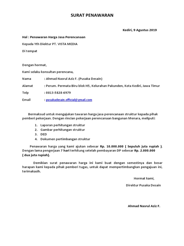 Contoh surat penawaran jasa konsultan perencanaan pekerjaan pembangunan gedung laboratorium biologi ugm yogyakarta (biaya personil & non personil)full. Demikian penjelasan lengkap mengenai contoh surat penawaran barang, jasa, serta cara untuk membuatnya. Dari beberapa contoh surat penawaran jasa di bawah ini, dapat disimpulkan bahwa surat penawaran produk barang dan jasa sebenarnya tidak jauh berbeda. Contoh dokumen lelang untuk jasa konstruksi. Contoh surat penawaran jasa konsultan.